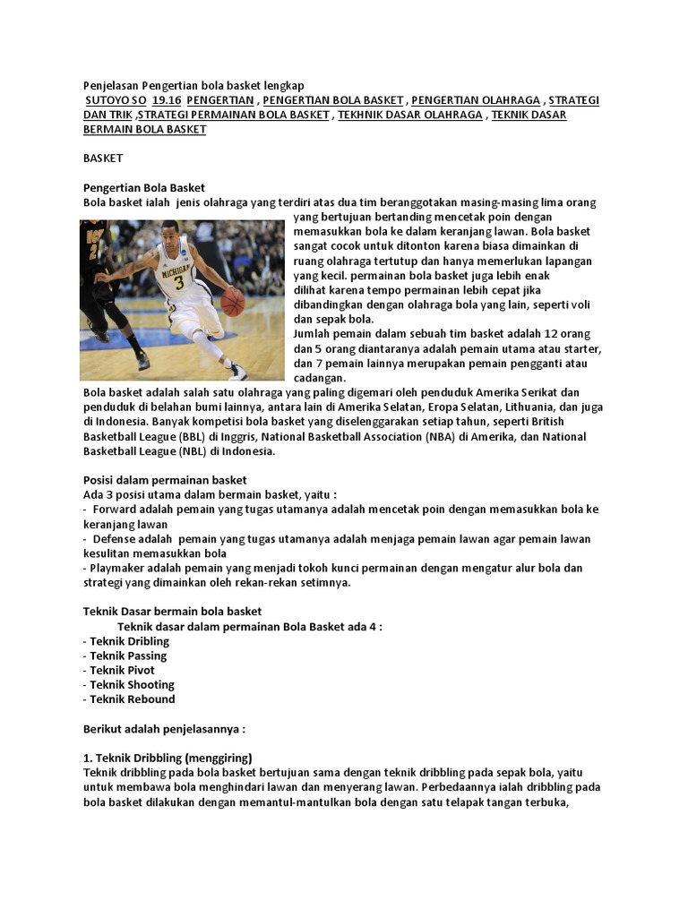 Berikut 7 teknik dasar bola basket : Pengertian bola basket, sejarah, ukuran lapangan dan teknik dasarnya. Teknik rebound dalam bola basket. Dalam permainan bola basket terdapat beberapa peraturan yang harus dipahami dan dipatuhi agar dapat bermain bola basket dengan baik. Dalam permainan bola basket, ada beberapa teknik dasar yang harus dikuasai oleh setiap pemain. Peraturan ini dapat menyatakan bahwa para pemain tidak boleh ada di daerah terlarang lawannya selama lebih dari 3 detik saat tim yang sedang menguasai bola di daerah lawannya dan jam sedang berlangsung. Rebound dalam permainan bola basket adalah istilah saat pemain menerima bola pantul yang gagal masuk ke dalam ring. Pengertian pivot basket dan cara melakukannya. Diketahui dalam permainan bola basket ini mempunya teknik memegang bola tersendiri, begitupula dengan teknik passing, teknik dribling, pivot, shooting, lay up. Teknik dasar dalam permainan bola basket adalah passing, dribbling, shooting, pivot, dan rebound. Dilansir dari situs basketball hq, rebound merupakan kondisi di mana seorang pemain menembak bola ke ring lawan namun gagal karena. Pertandingan bola basket diselenggarakan di ruangan yang. Yang dimaksud dengan teknik over head pass dalam permainan bola basket adalah salah satu cara untuk melakukan operan atau memberikan passing kepada rekan satu tim dengan bola terlebih dahulu dipegang di atas kepala dan baru kemudian di lempar atau di umpankan pada rekan satu tim.